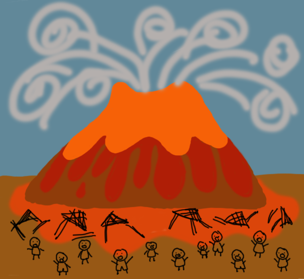 ▲ Above is the drawn picture of people escaping from a volcanic eruptions , with the volcanic lava destroying the houses in the way.